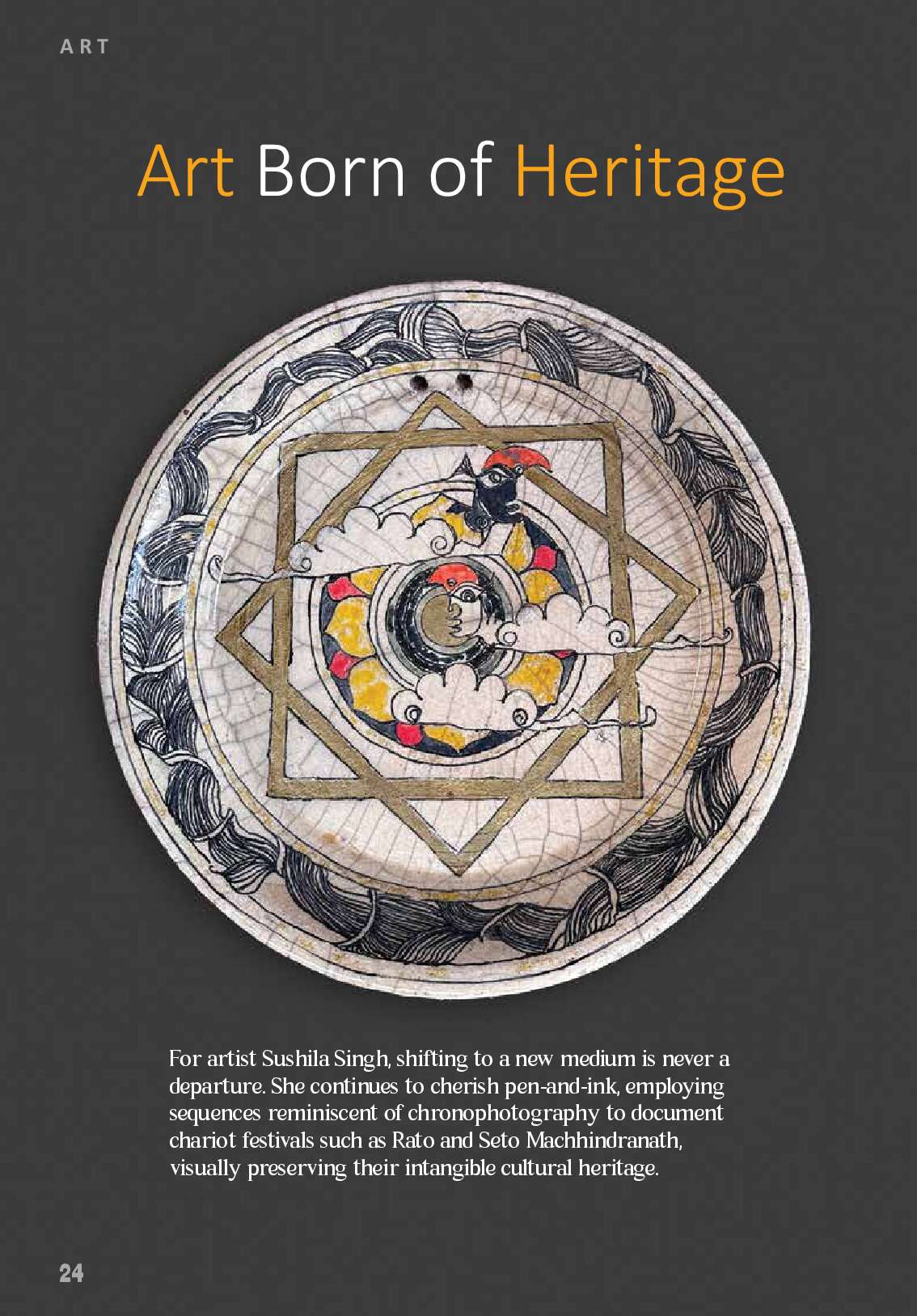 For artist Sushila Singh, Shifting to a new medium is never a departure. She continues to cherish pen-and-ink, employing sequences reminiscent of chronophotography to document chariot festivals such as Rato and Seto Machhindranath, visually preserving their intangible cultural heritage.