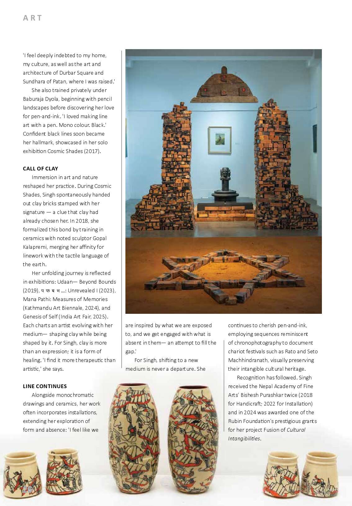 Her unfolding journey is reflected in exhibitions: Uddan – Beyond Bounds (2019), k km a e d …. : Unrevealed I (2023) Mana Pathi: Measures of Memories (Kathmandu Art Biennale, 2024), and Genesis of Self (India Art Fair, 2025). Each charts an artist evolving with her medium – shaping clay while being shaped by it. For Singh, clay is more than an expression; it is a form of healing. ‘I find it more therapeutic than artistic,’ she says.