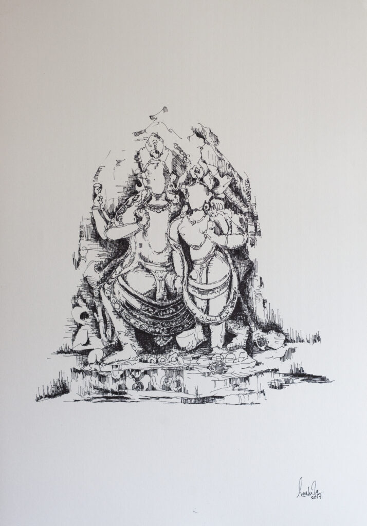 She also trained privately under Baburaja Dyola, beginning with pencil landscapes before discovering her love for pen-and-ink. ‘I loved making line art with a pen. Mono colour. Black.’ Confident black lines soon became her hallmark, showcased in her solo exhibition Cosmic Shades (2017).
