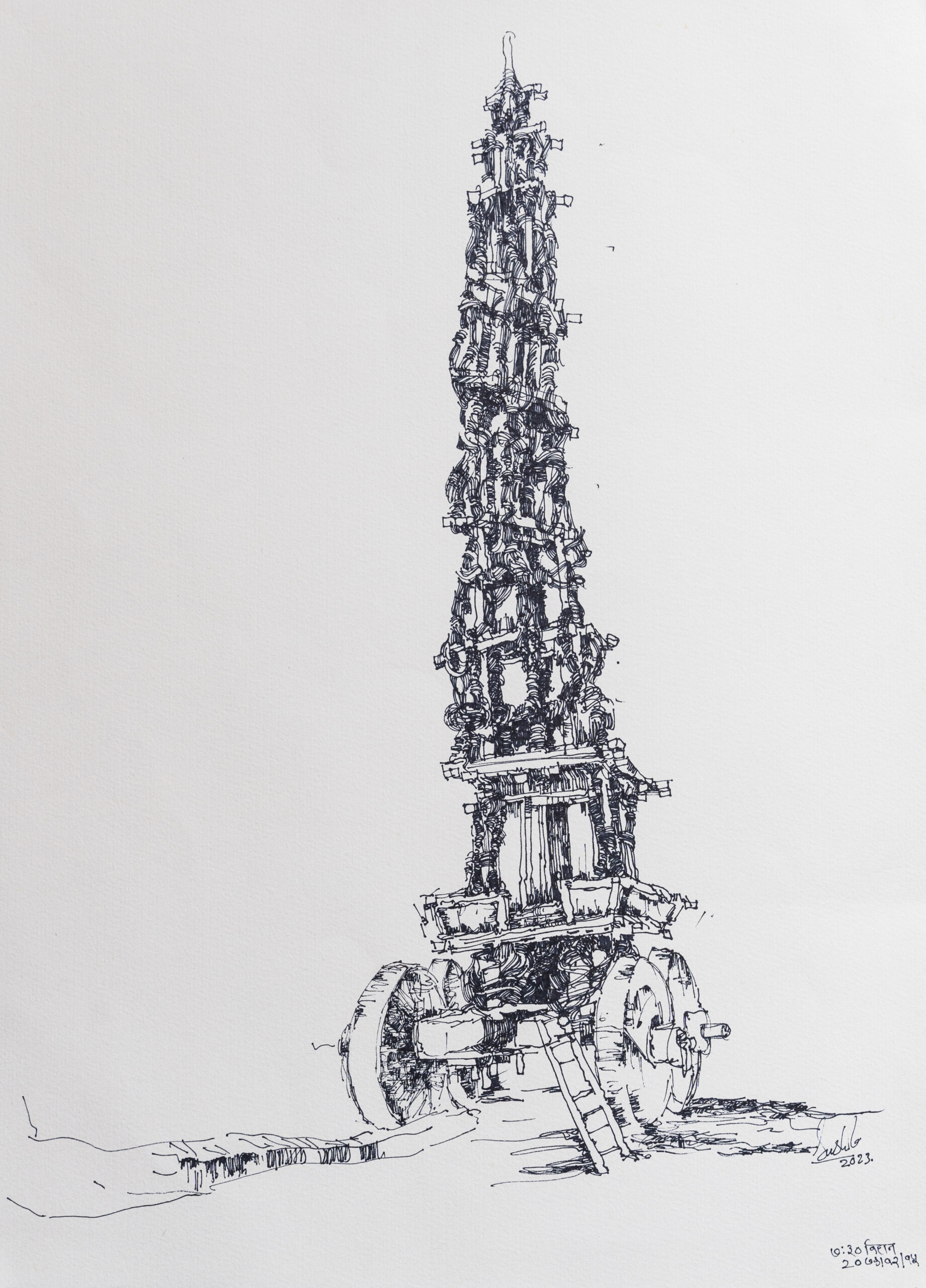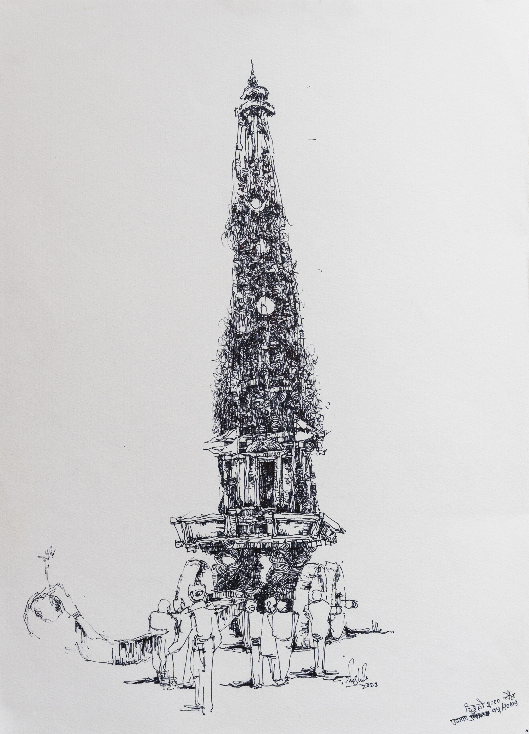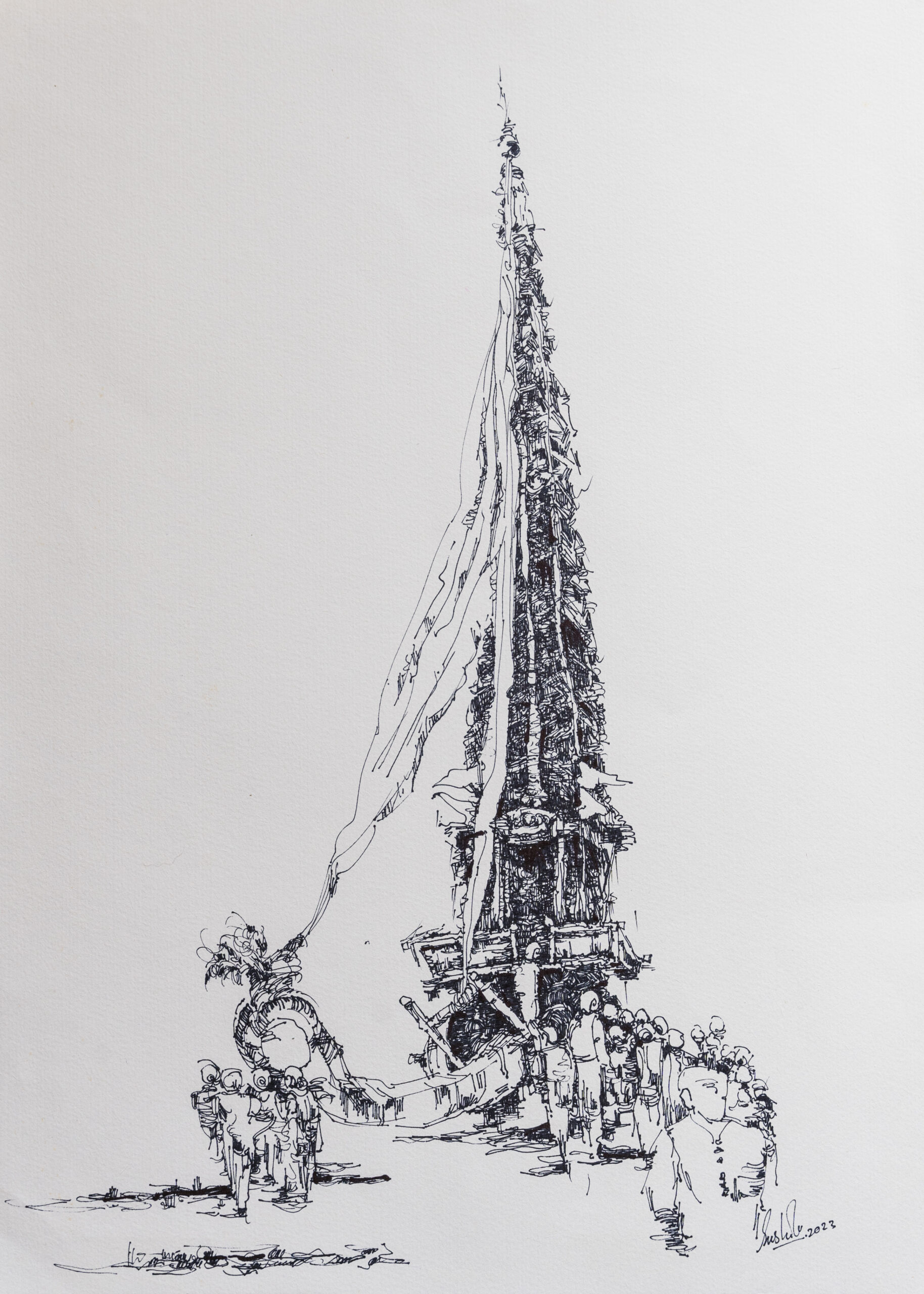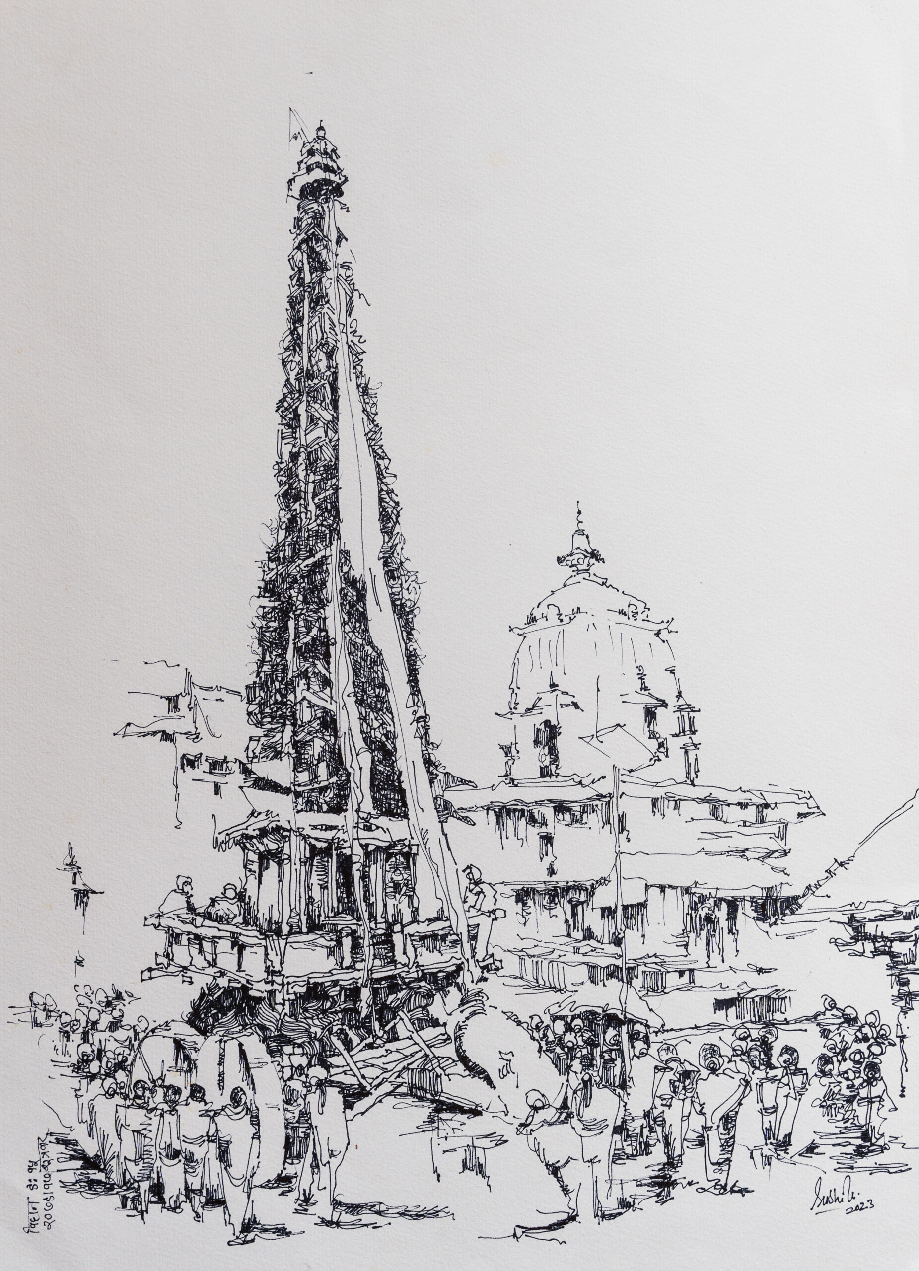 Her works document the meticulous craftsmanship involved in constructing the towering rath, from the binding of its wooden framework to the sacred ornaments that adorn it. Each sketch traces the movement of the chariot as it is pulled through different parts of the city, echoing the collective effort, faith, and celebration that define this centuries-old tradition.