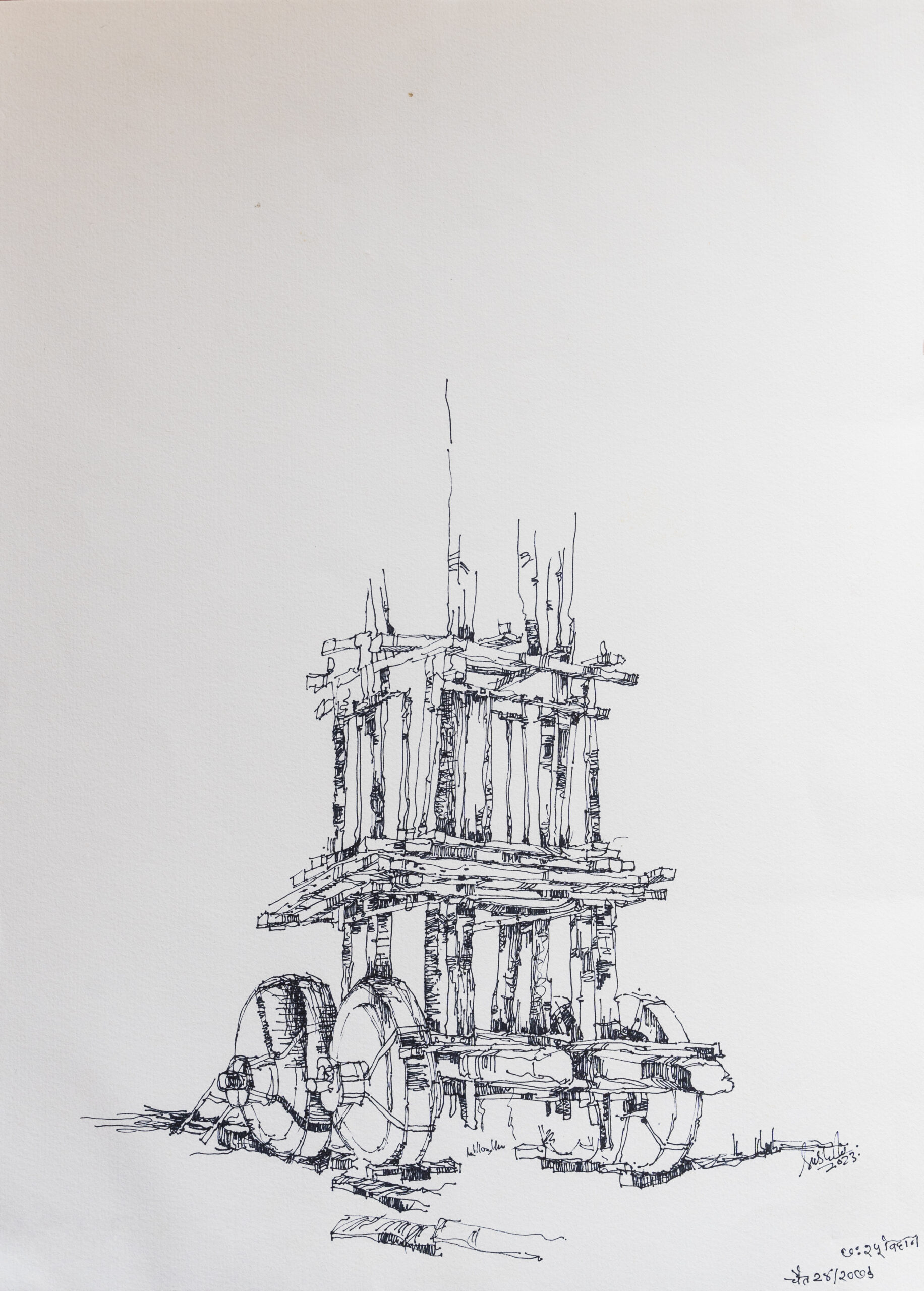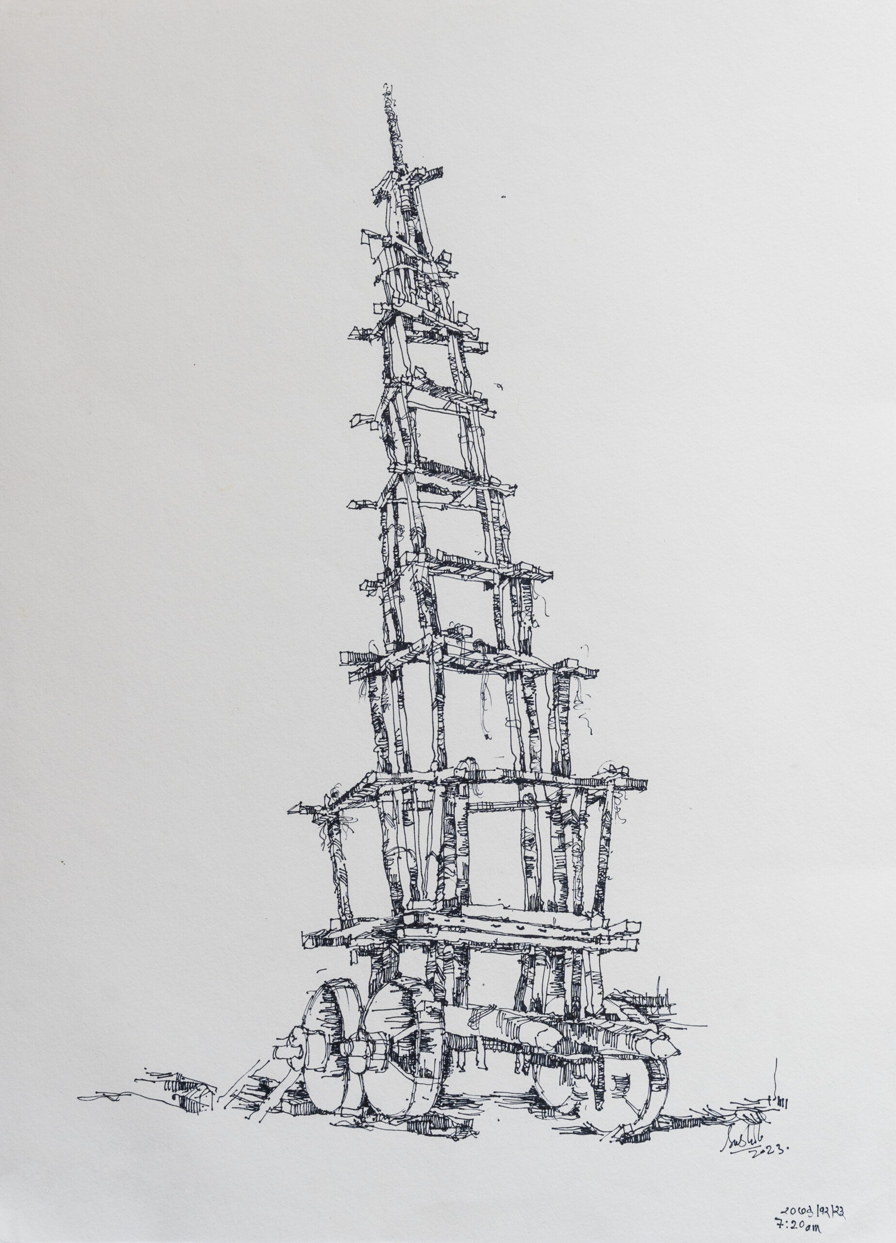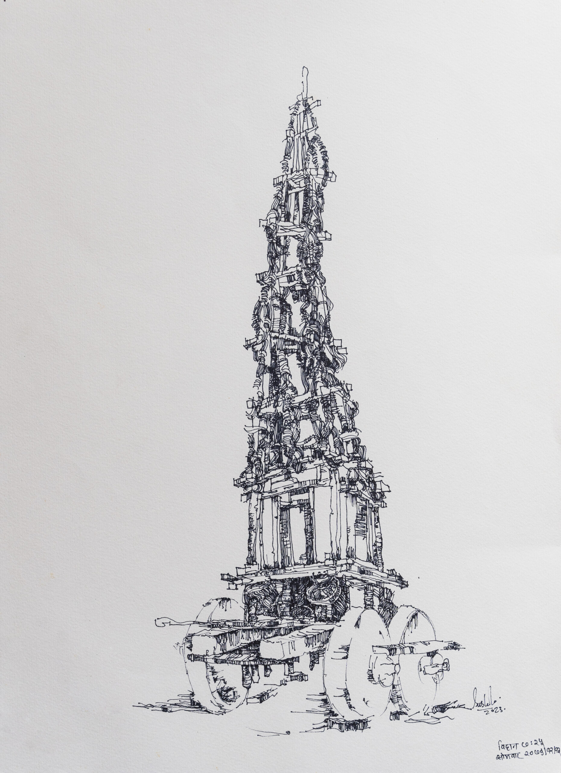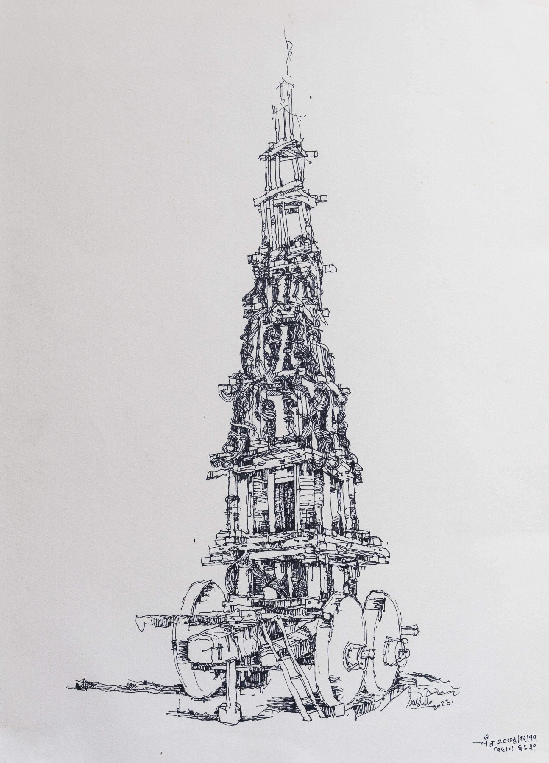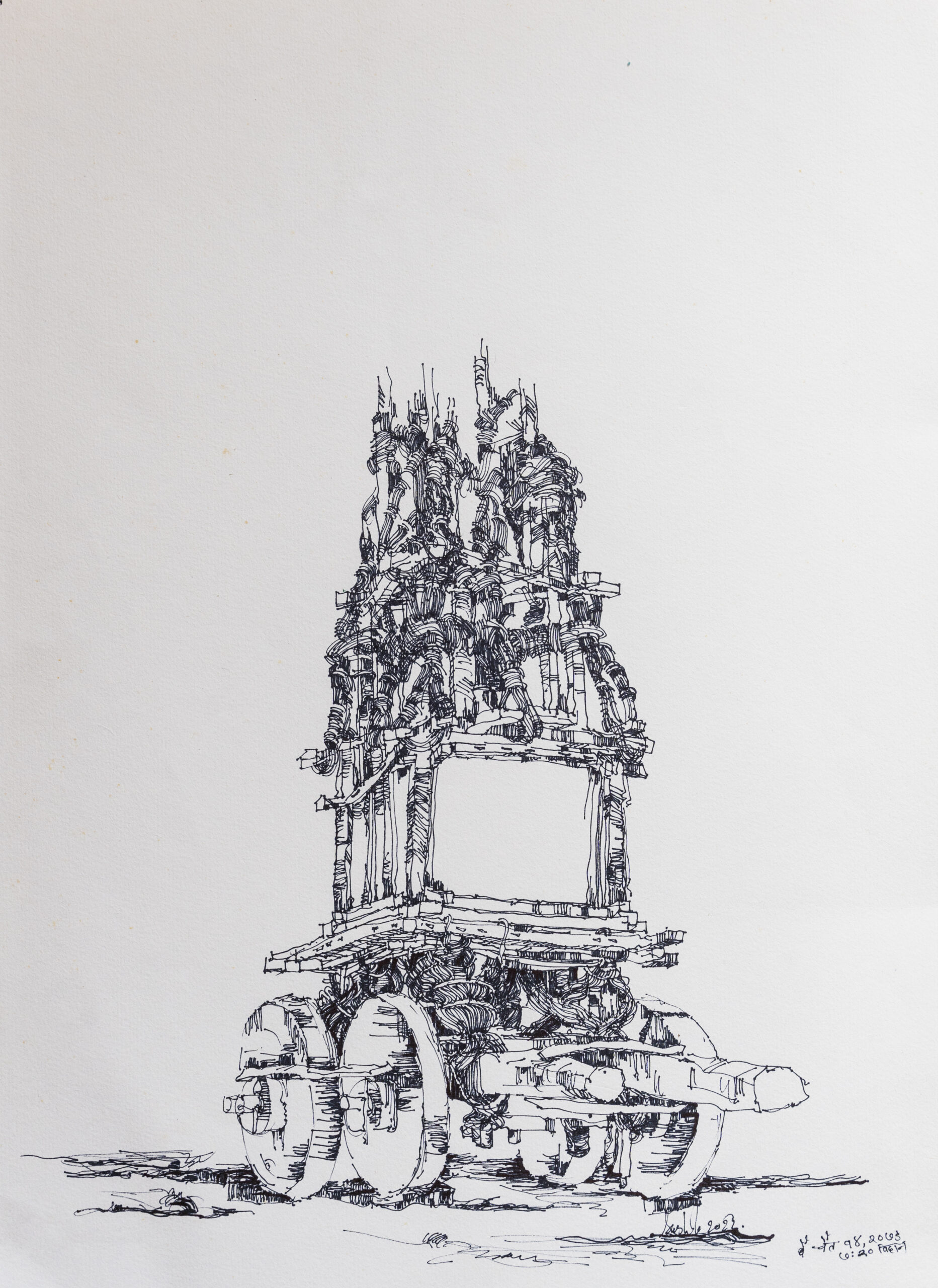 Her works document the meticulous craftsmanship involved in constructing the towering rath, from the binding of its wooden framework to the sacred ornaments that adorn it. Each sketch traces the movement of the chariot as it is pulled through different parts of the city, echoing the collective effort, faith, and celebration that define this centuries-old tradition.