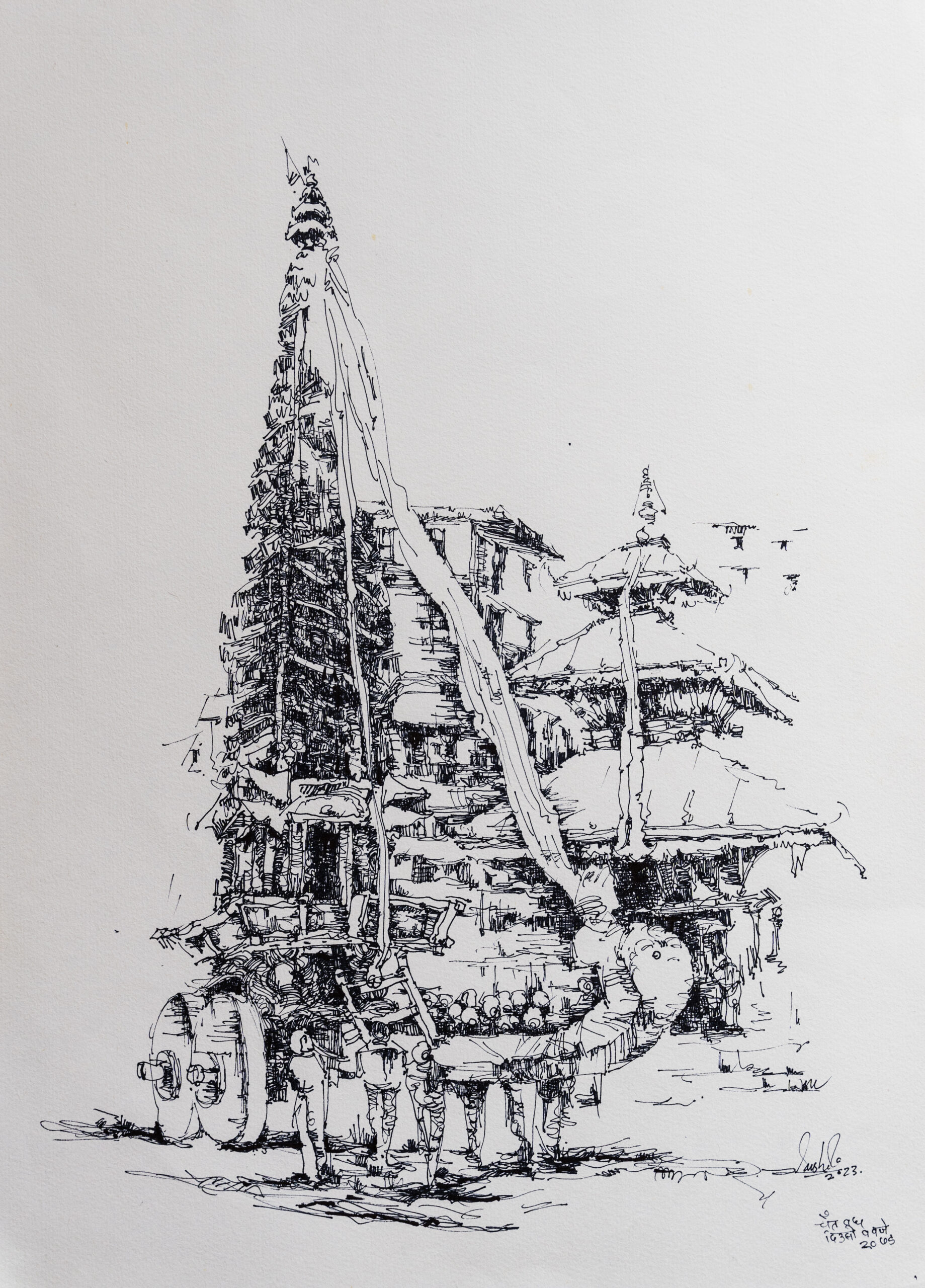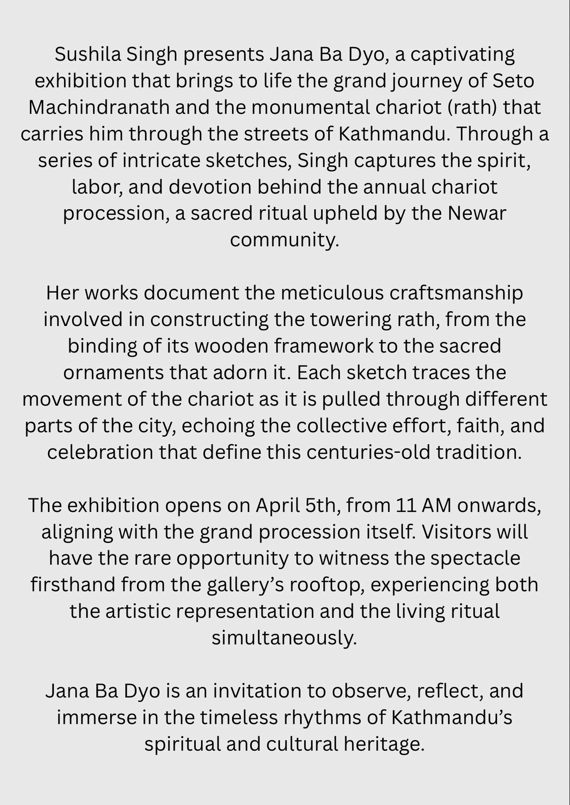 Sushila Singh presents Jana Ba Dyo, a captivating exhibition that brings to life the grand journey of Seto Machindranath and the monumental chariot (rath) that carries him through the streets of Kathmandu. Through a series of intricate sketches, Singh captures the spirit, labour, and devotion behind the annual chariot procession, a sacred ritual upheld by the Newar community.